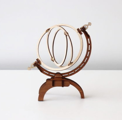• Questo modello si ispira al Foglio 13v del Codice di Madrid I, a margine del quale figura lo schizzo di una sospensione ad anelli, oggi chiamata “Sospensione Cardanica” a cui Leonardo aggiunge pochissime parole: “Sia voltata una palla per qualunque verso senza voltare il suo centro”.