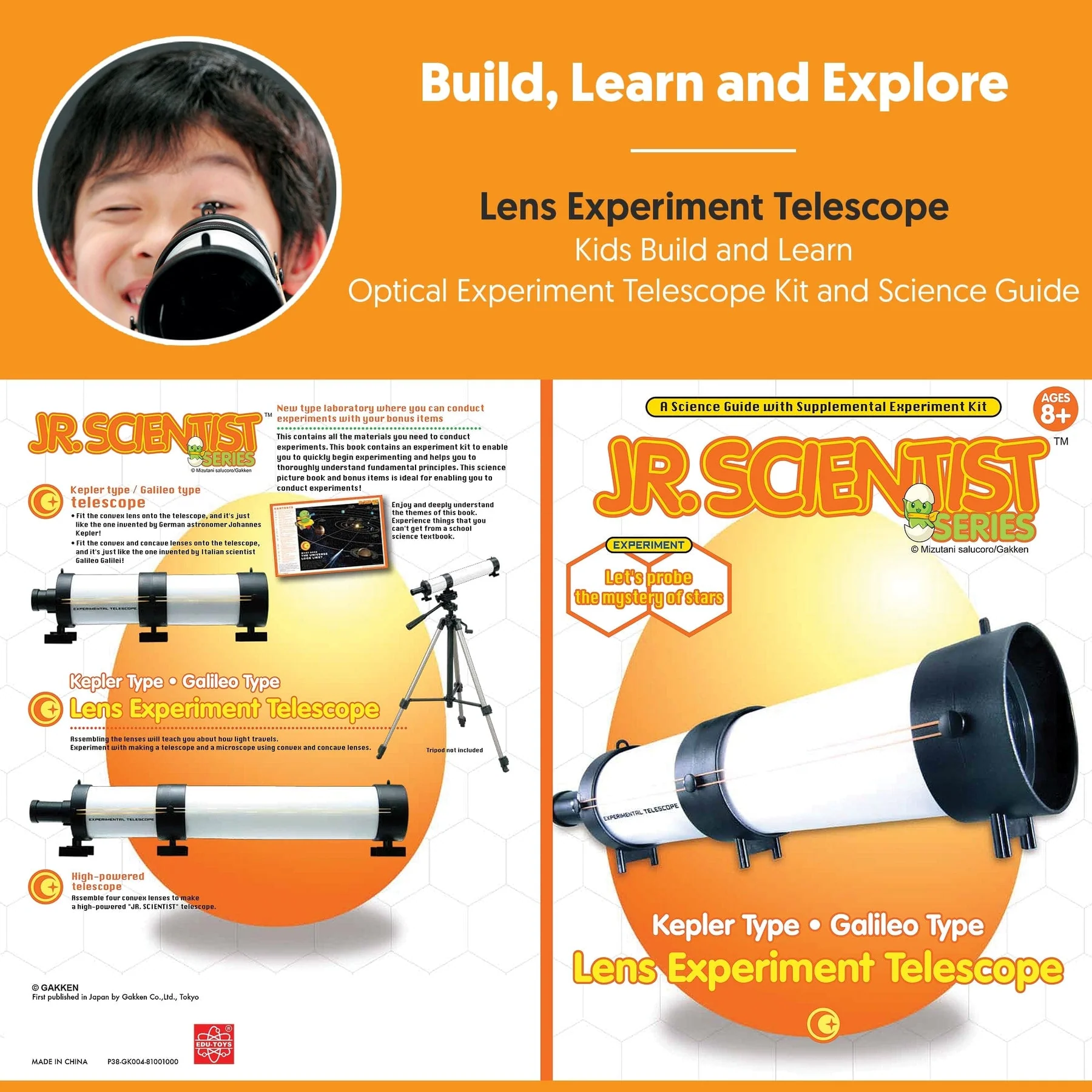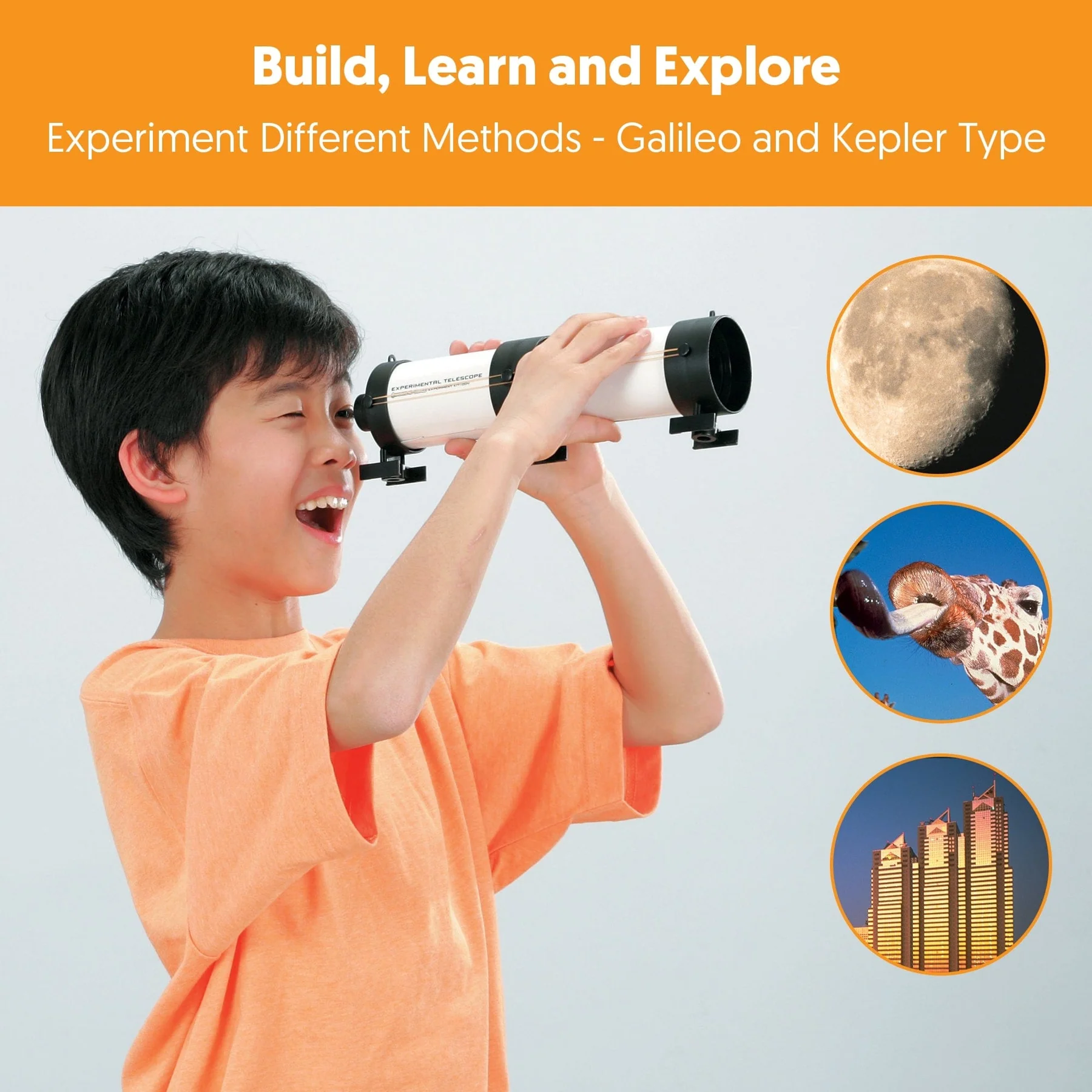 • Il fantastico kit di 30 pezzi per telescopi permette al bambino di costruire e conoscere tre diversi tipi di telescopi, le lenti, Galileo, il sistema solare e molto altro ancora.