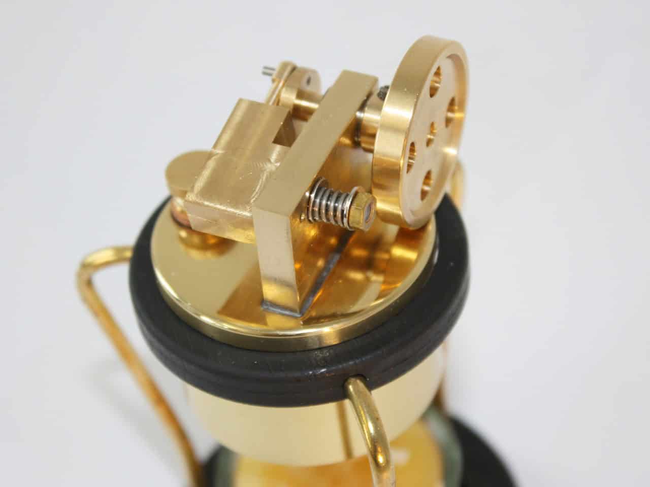 Riscaldato alla luce di una candela di cera d’api, il cilindro oscillante in filigrana ronza su e giù e aziona vivacemente il volano scintillante.