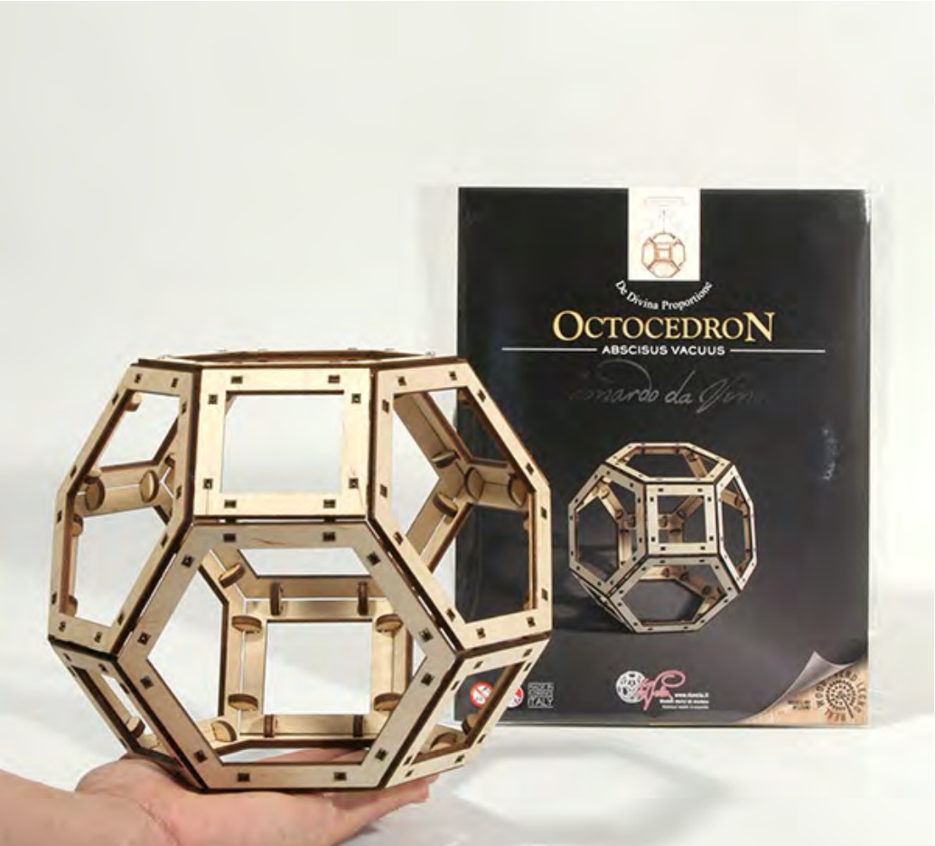 Octacedron Abscisus Vacuus: raffinato modello matematico 3D ispirato ai disegni di Leonardo da Vinci dal trattato “De Divina Proportione”. Composto da 8 esagoni e 6 quadrati con 74 giunti ad incastro, montabile senza colla. Strumento didattico superiore per docenti, educatori STEM e studiosi di geometria rinascimentale.