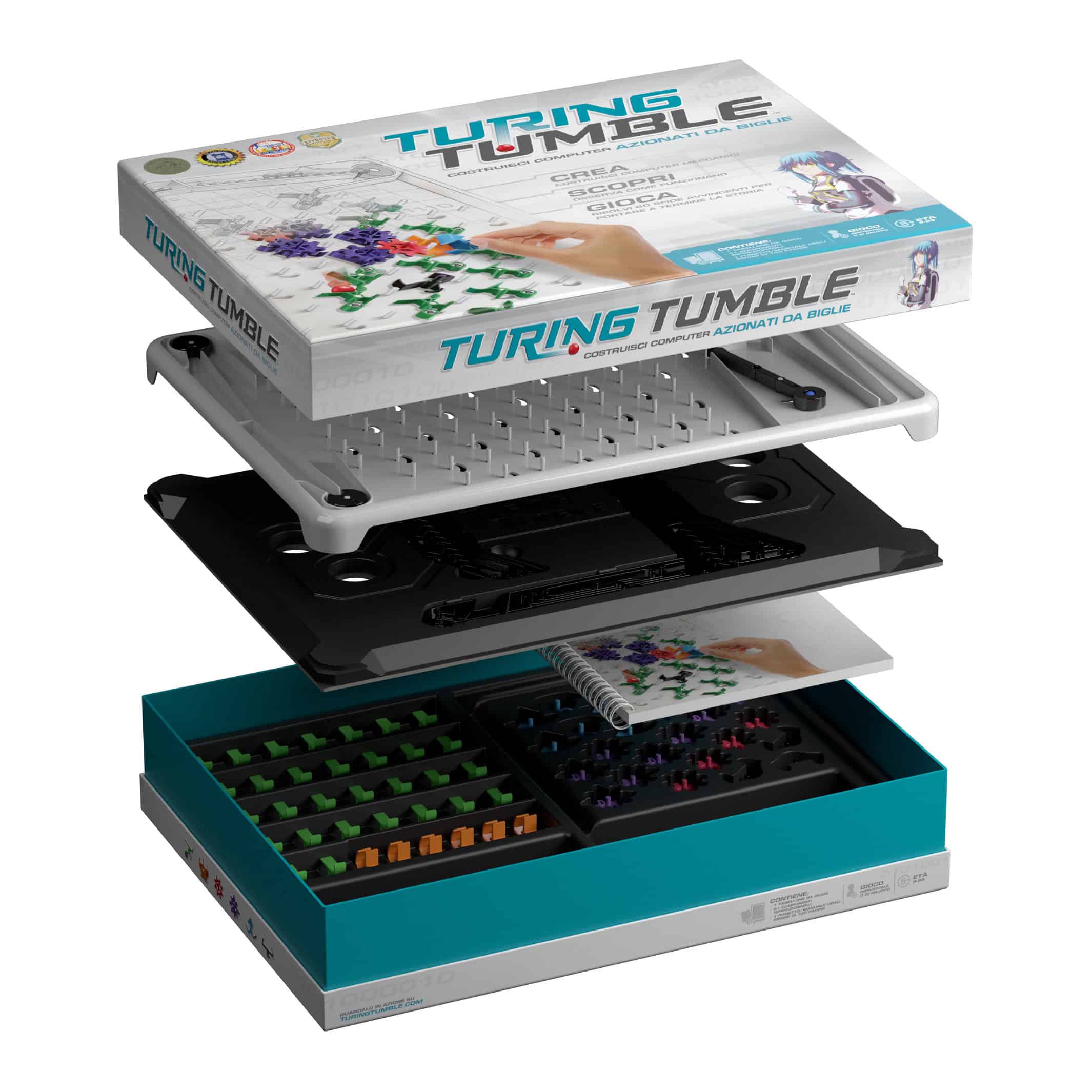 Turing Tumble è un nuovo tipo di gioco in cui i giocatori (dagli 8 ai 99 anni) costruiscono computer meccanici azionati da biglie per risolvere enigmi di logica. Usa rampe, incroci, bit, intercettatori, ingranaggi e bit con ingranaggio per costruire computer azionati da biglie in grado di generare schemi, usare la logica, contare, sommare, sottrarre, moltiplicare, dividere e molto altro ancora. Scopri come funzionano i computer!