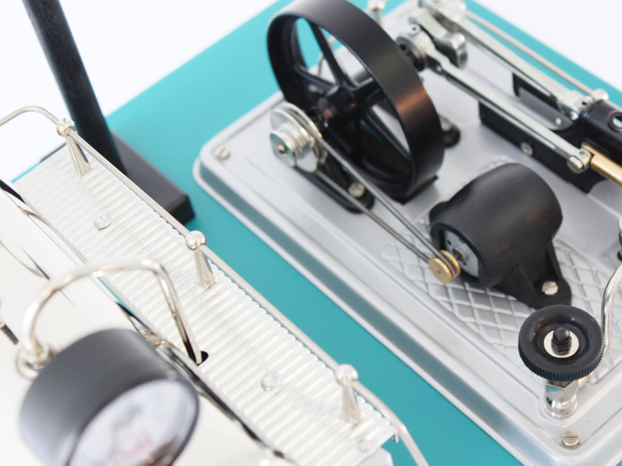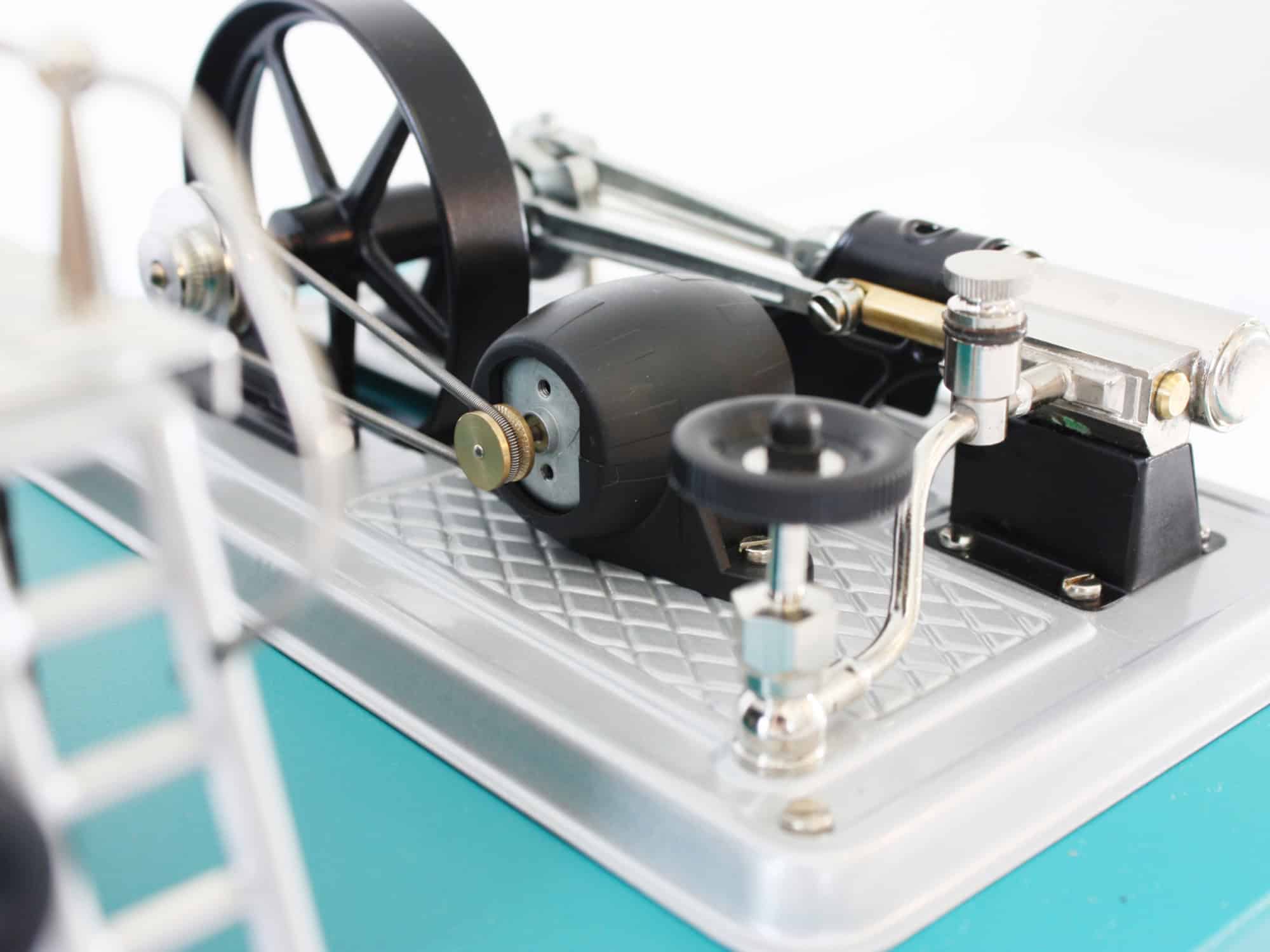 Motore a vapore Wilesco D18: questo modello presenta una combinazione di colori unica con piastra di base blu, rivestimento della caldaia nero e piastra aggregata argento. Il volano è verniciato di nero.