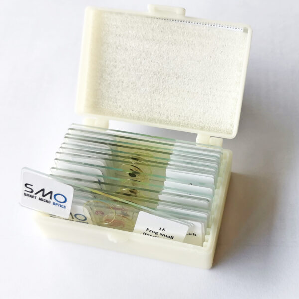 Set di vetrini per microscopia di zoologia. 15 pezzi e scatola di plastica.